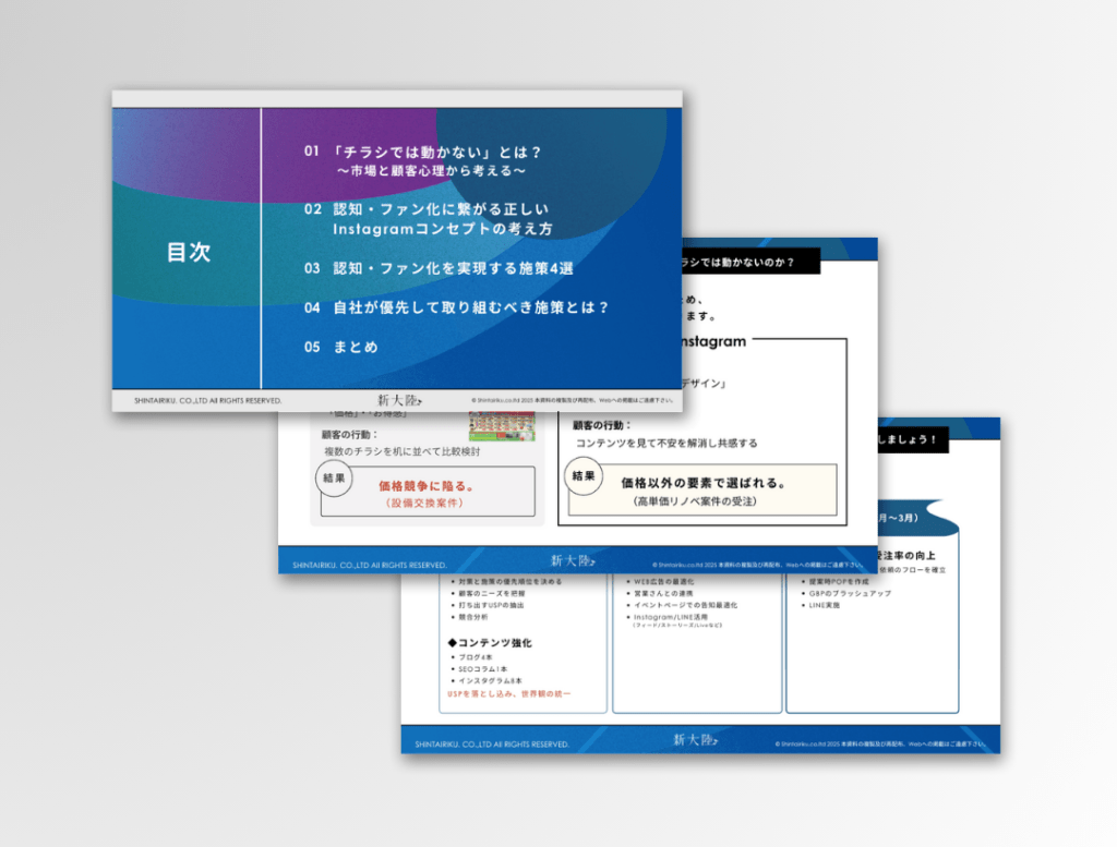 本資料・動画では、Instagramを単なる「写真置き場」ではなく、お客様の不安を解消し信頼を積み重ねる「メディア」として活用するための戦略を解説します。