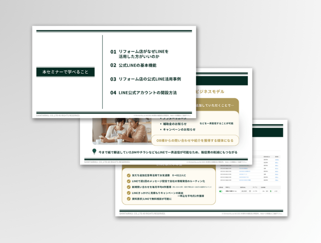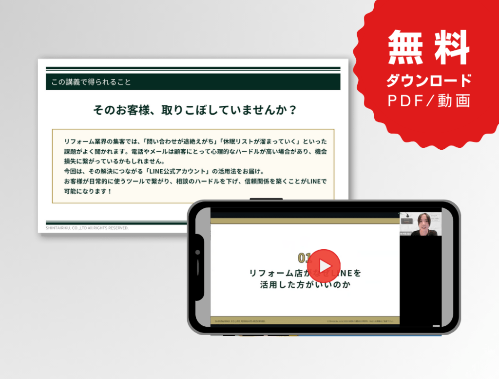 本コンテンツでは、リフォーム会社の経営者様やマーケティング担当者様を対象に、LINE運用の基礎から、明日から使える具体的な営業活用法までをわかりやすく解説します。 予備知識ゼロの方でも理解できるよう、丁寧にまとめています。 「LINEをどうビジネスに活かすべきか分からない」「業界に特化した活用事例が知りたい」という方は必見です。
