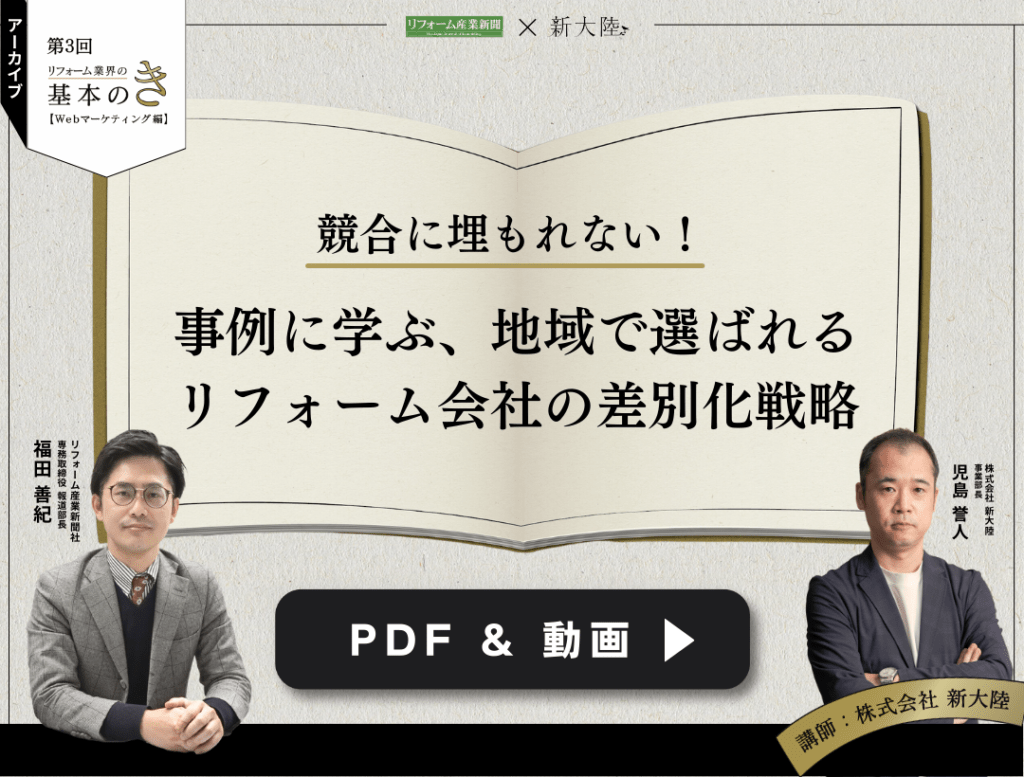 【PDF&動画】競合に埋もれない!事例に学ぶ、地域で選ばれるリフォーム会社の差別化戦略〜第3回リフォーム業界の基本のき〜