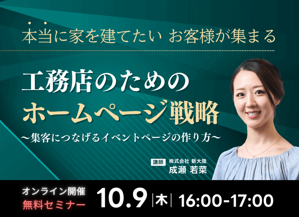 本セミナーでは、広告費に頼らず、「本当に家を建てたいお客様」だけを集めるための、イベントページの作り方を徹底解説します。