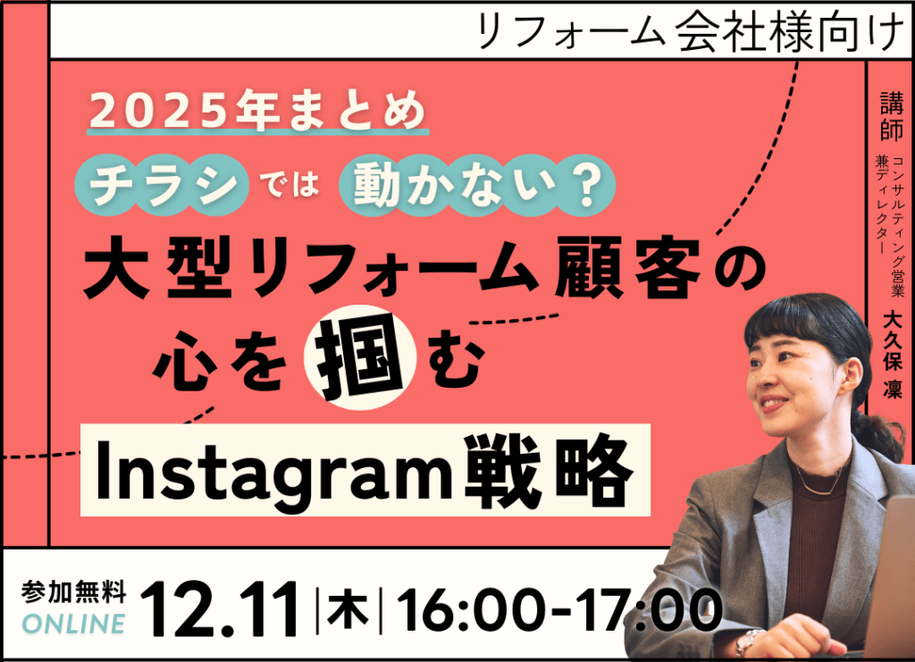 - 【リフォーム会社様向け】2025年まとめ チラシでは動かない?大型リフォーム顧客の心を掴むInstagram戦略